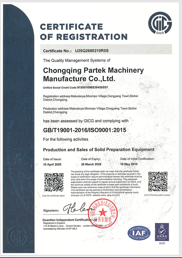 Сертификация дочерней компании Chongqing Partek Machinery Automation Equipment Company по системе менеджмента качества ISO 9001:2015